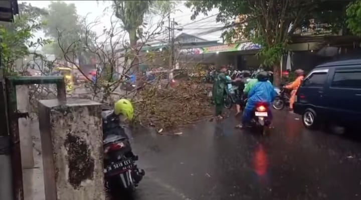 gomalang.idMalang,- Cuaca hujan disertai angin kencang di Kota Malang sejak beberapa hari ini,sebabkan beberapa pohon roboh.
